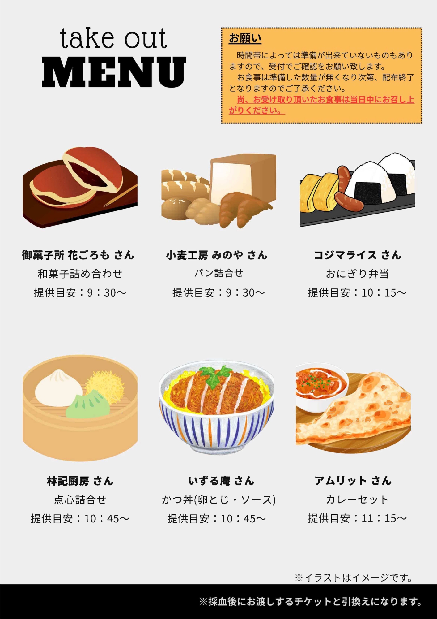 下記メニュー一覧には受取可能な時間の目安も記載していますので、ご参考までにご覧ください。