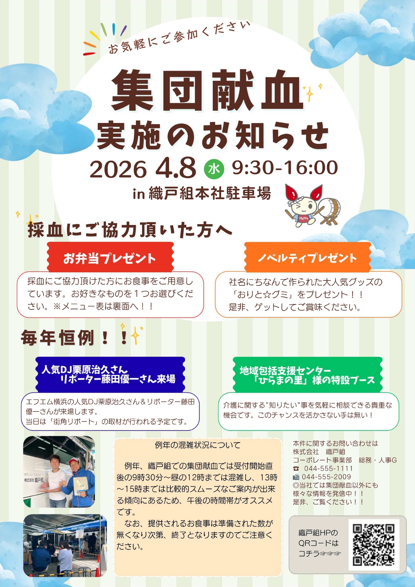 採血された方にはご協力いただいたささやかな御礼として、地元飲食店のお弁当と、社名の「織戸組」にちなんで作られたノベルティ「おりと☆グミ」もご用意しています。