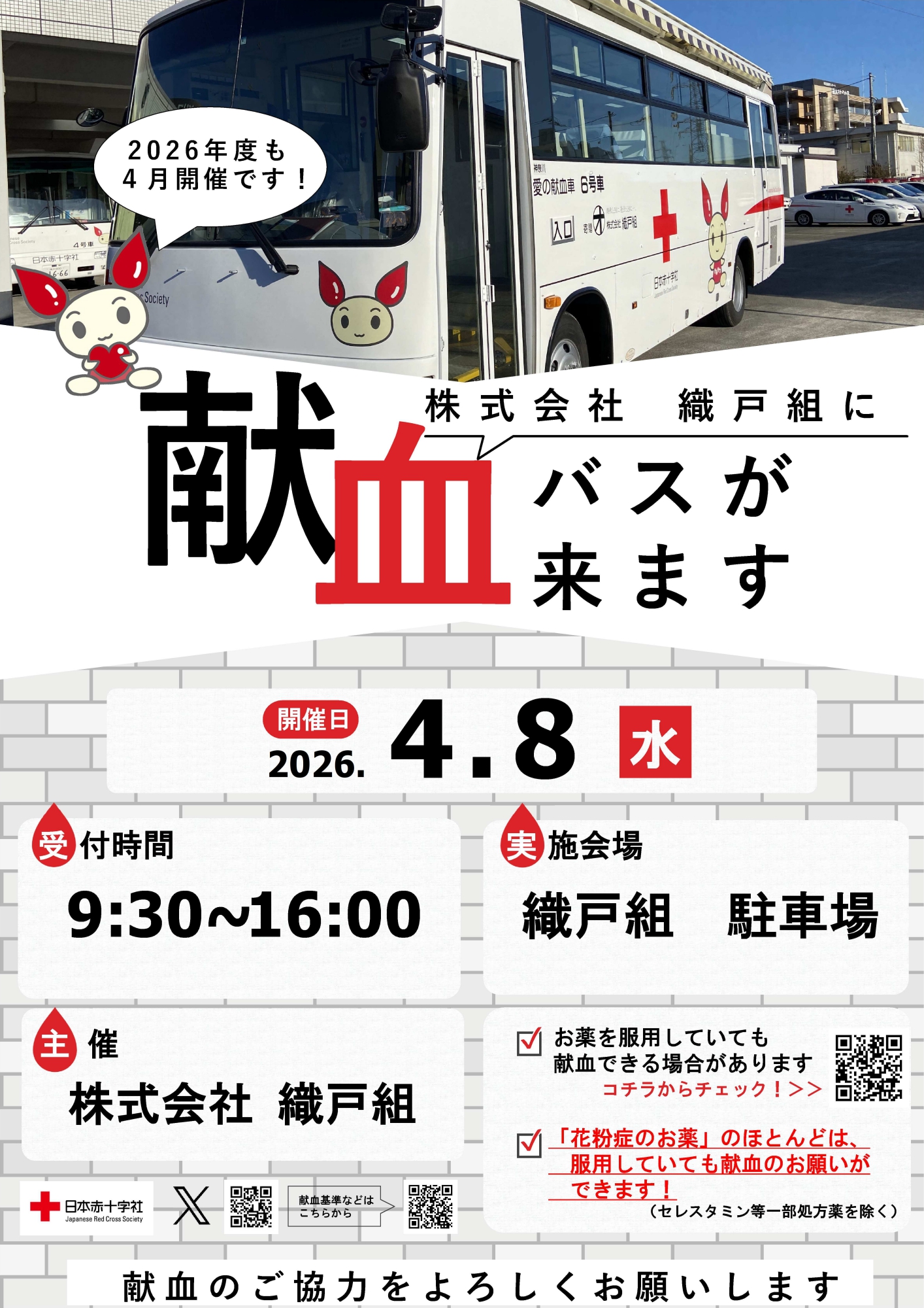 これまで献血をしたことがない方も、この機会に新年度の新たな一歩としてチャレンジしていただければ幸いです。